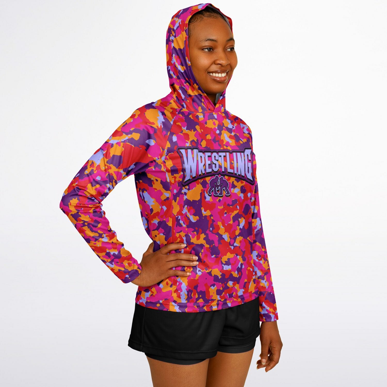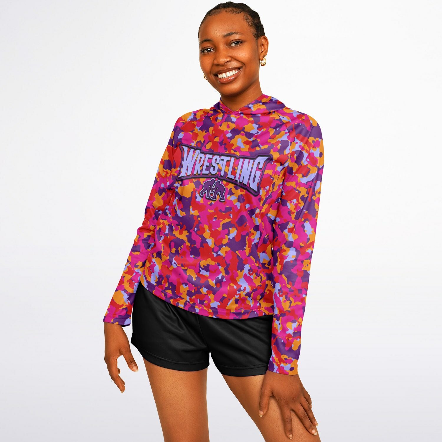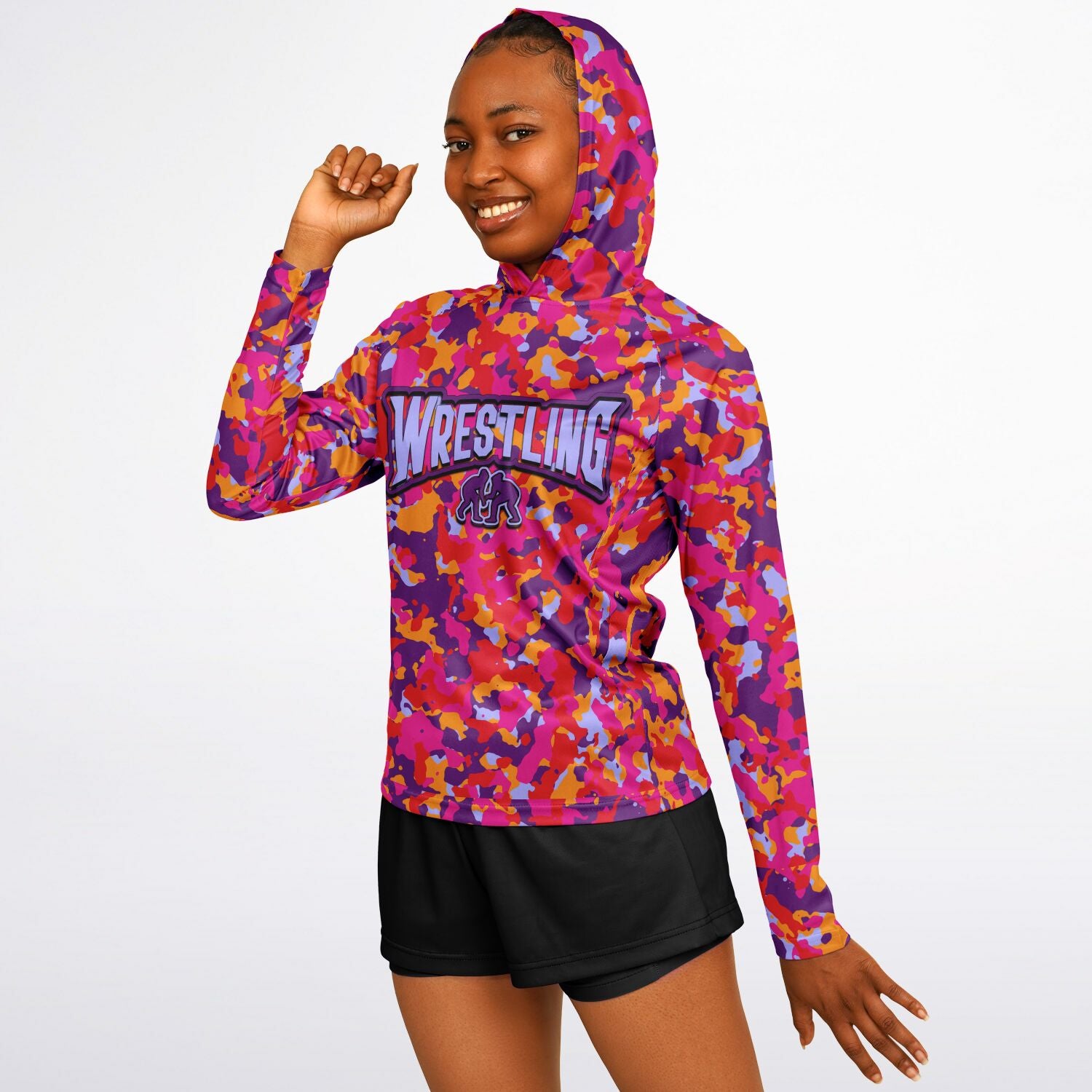 4Wrestlers Bright Pink Camo Women's Wrestling Long Sleeve Hooded Performance Shirt - AOP