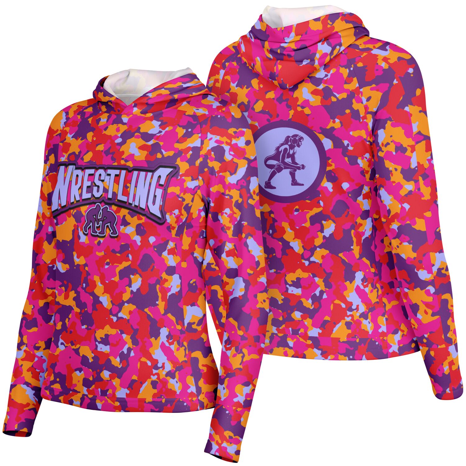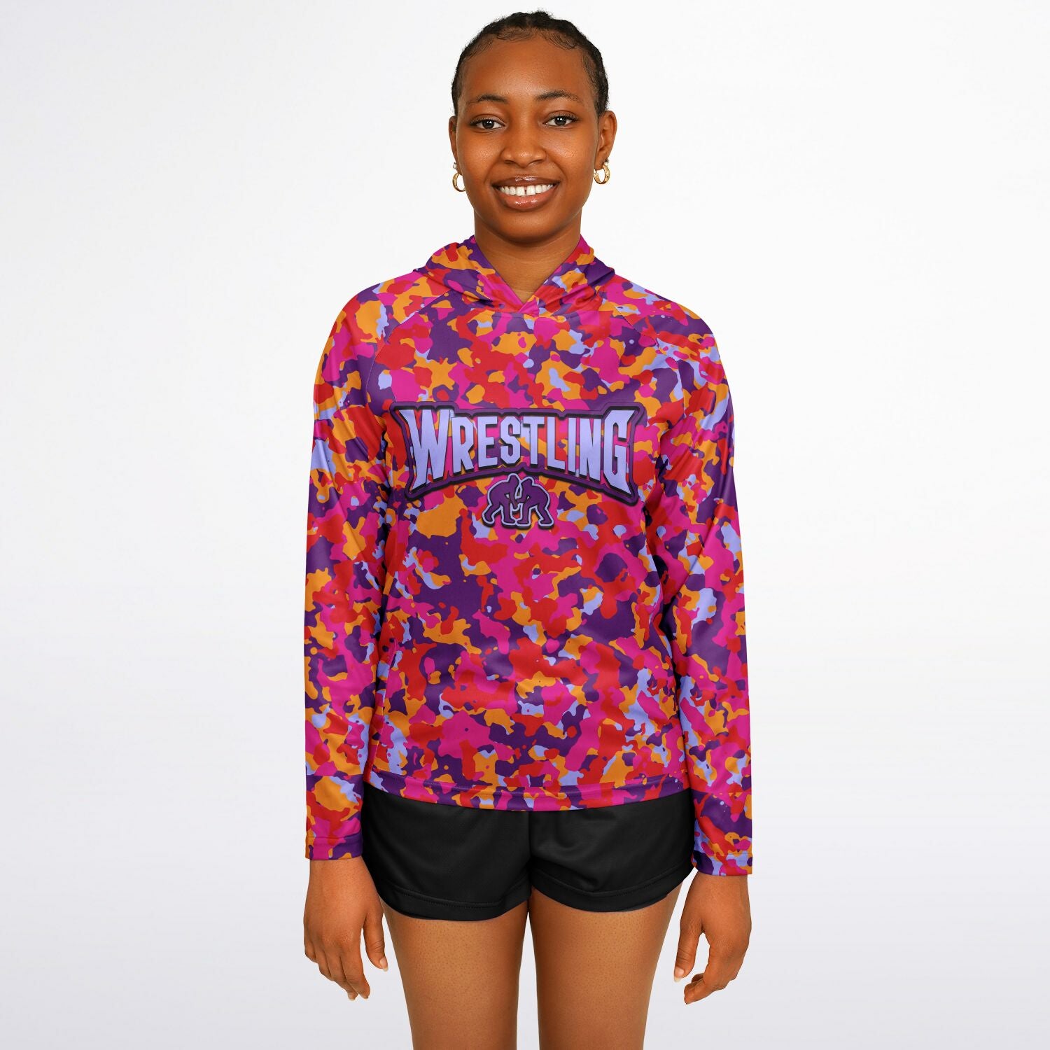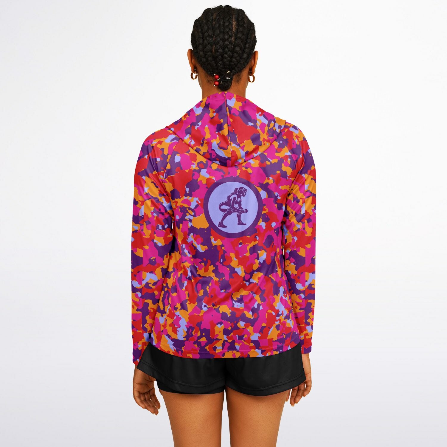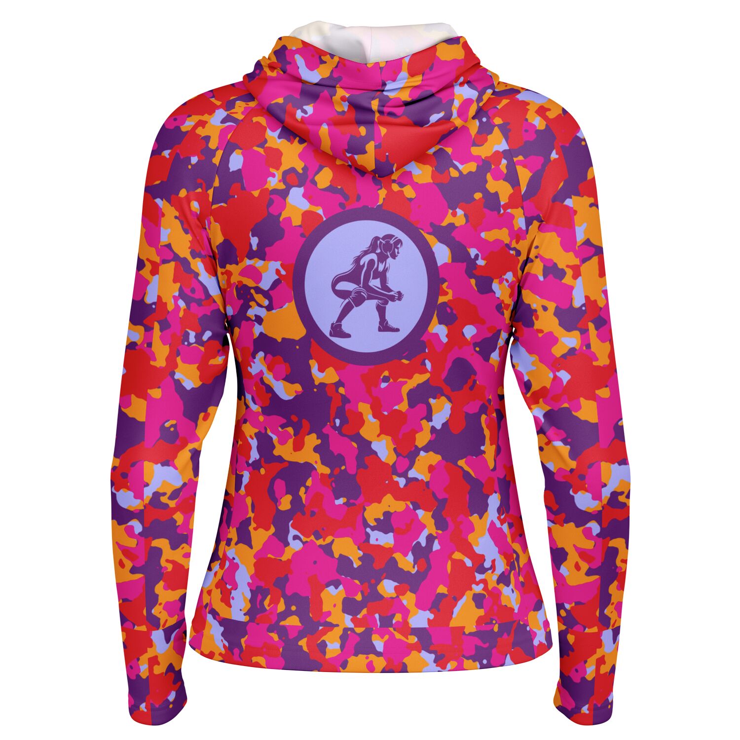 4Wrestlers Bright Pink Camo Women's Wrestling Long Sleeve Hooded Performance Shirt - AOP