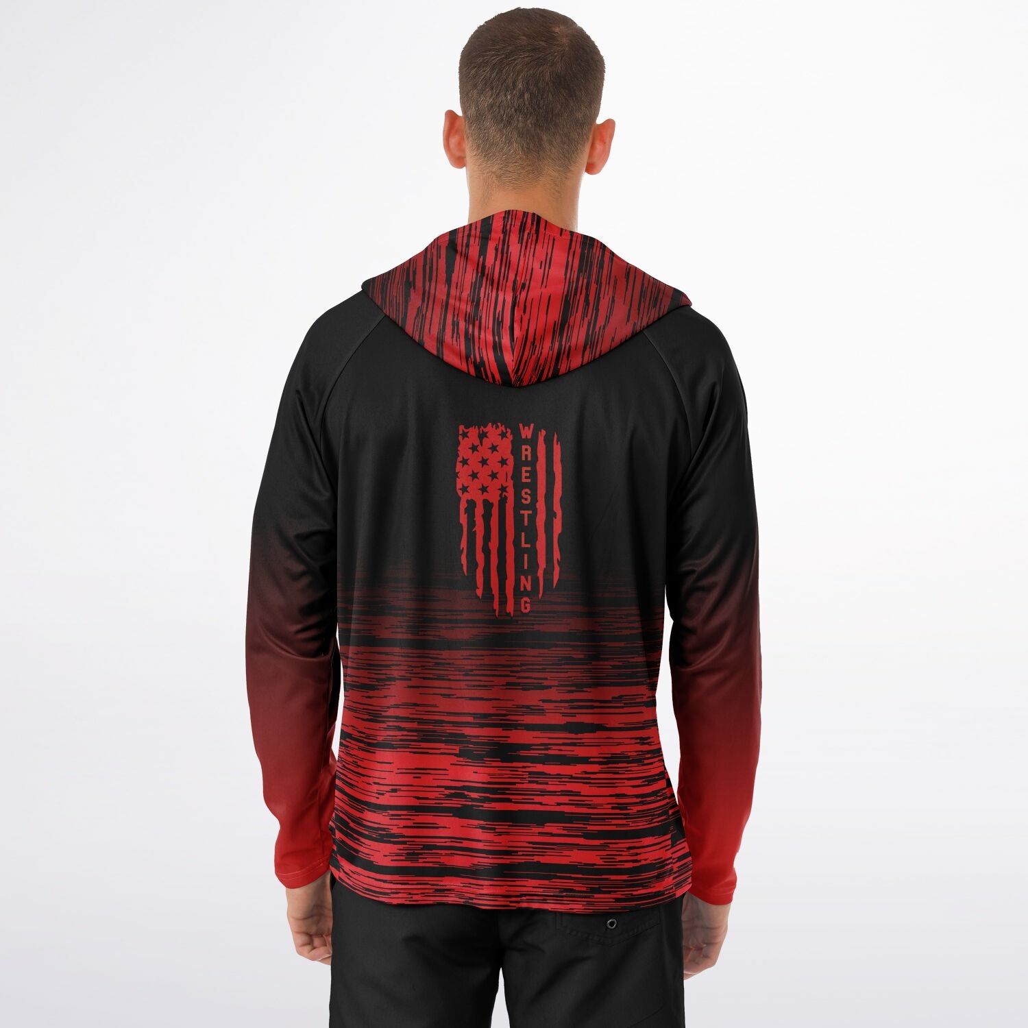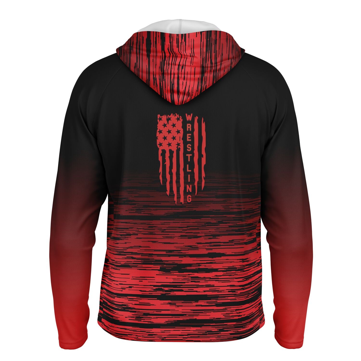 Patriotic USA Distressed Flag Men's Wrestling Long Sleeve Hooded Performance Shirt - AOP