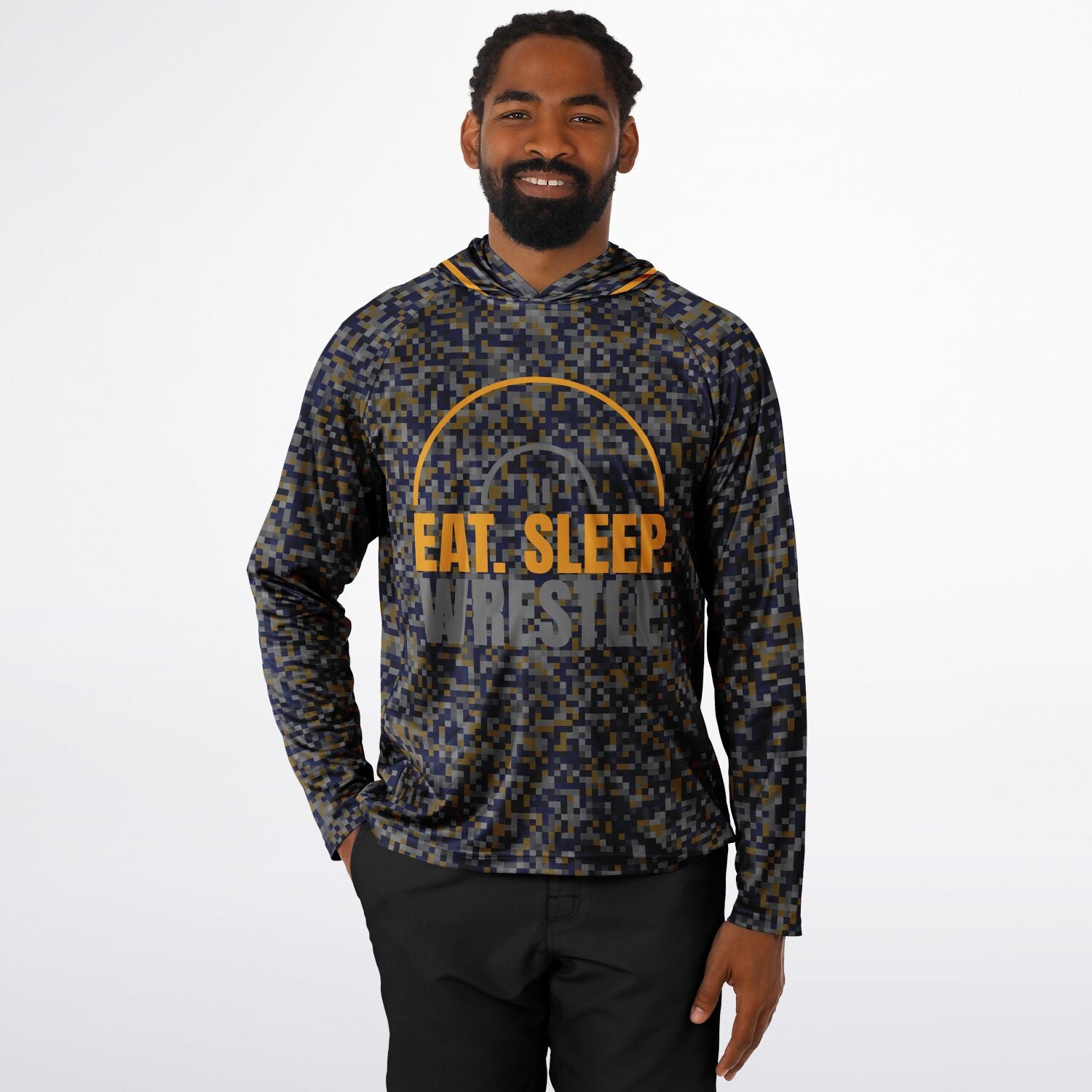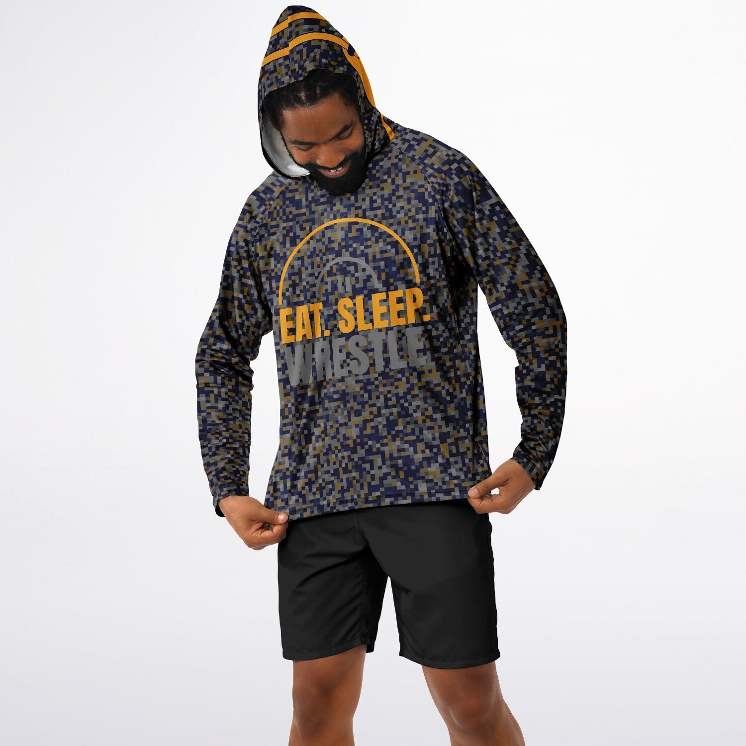 Eat Sleep West Virginia Men's Wrestling Long Sleeve Hooded Performance Shirt - AOP Minecraft Camo