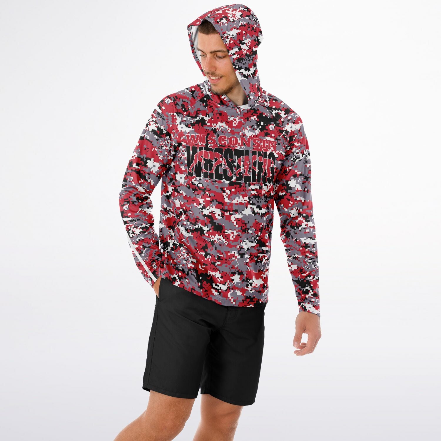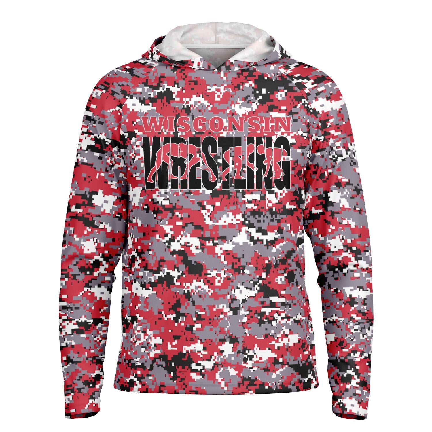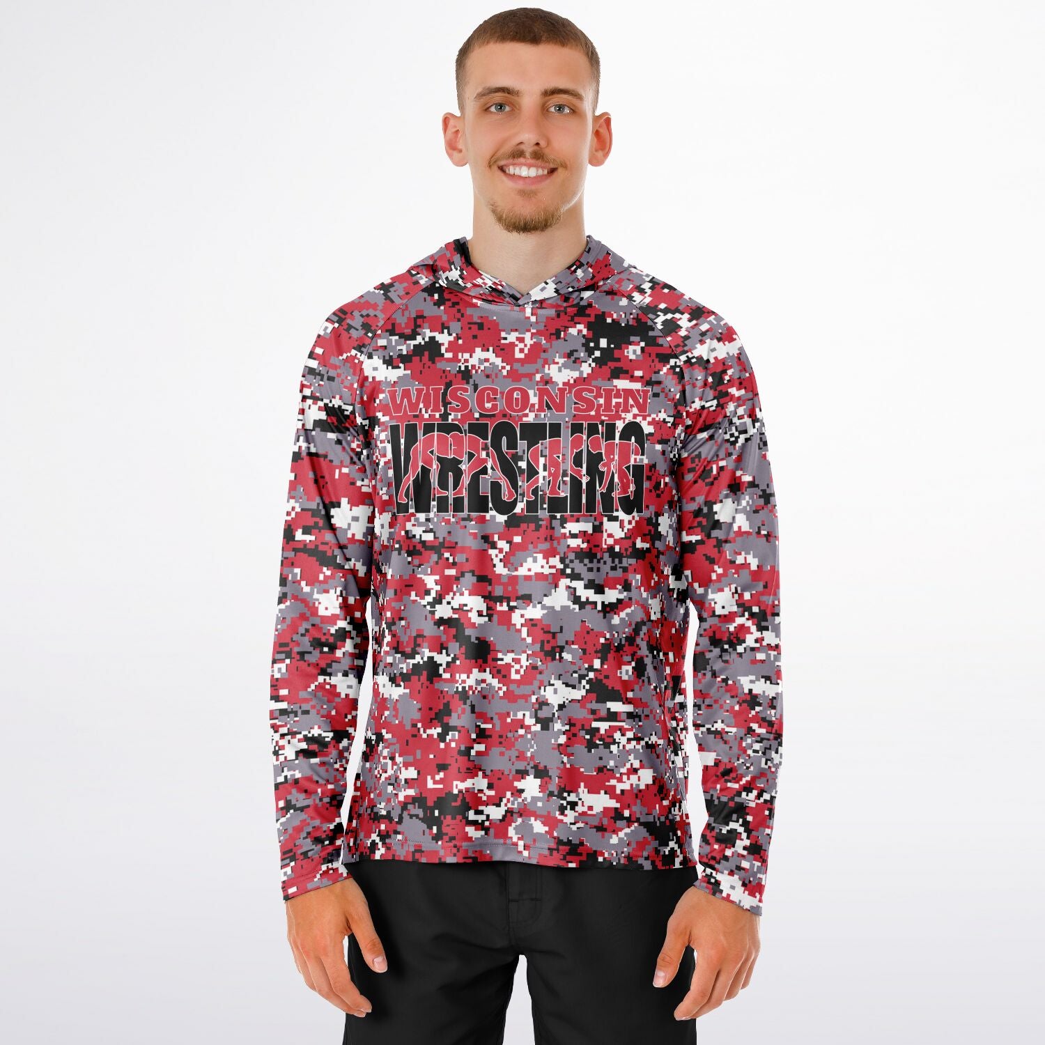 State of Wisconsin Wrestling Men's Wrestler Long Sleeve Hooded Performance Shirt - AOP Pixel Camo