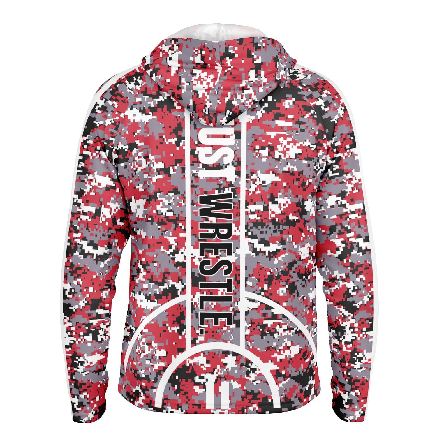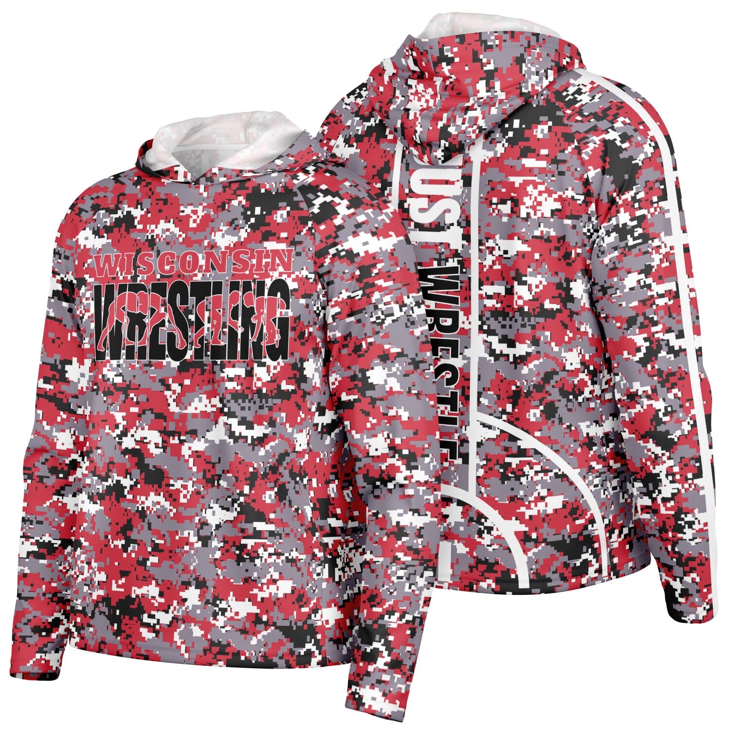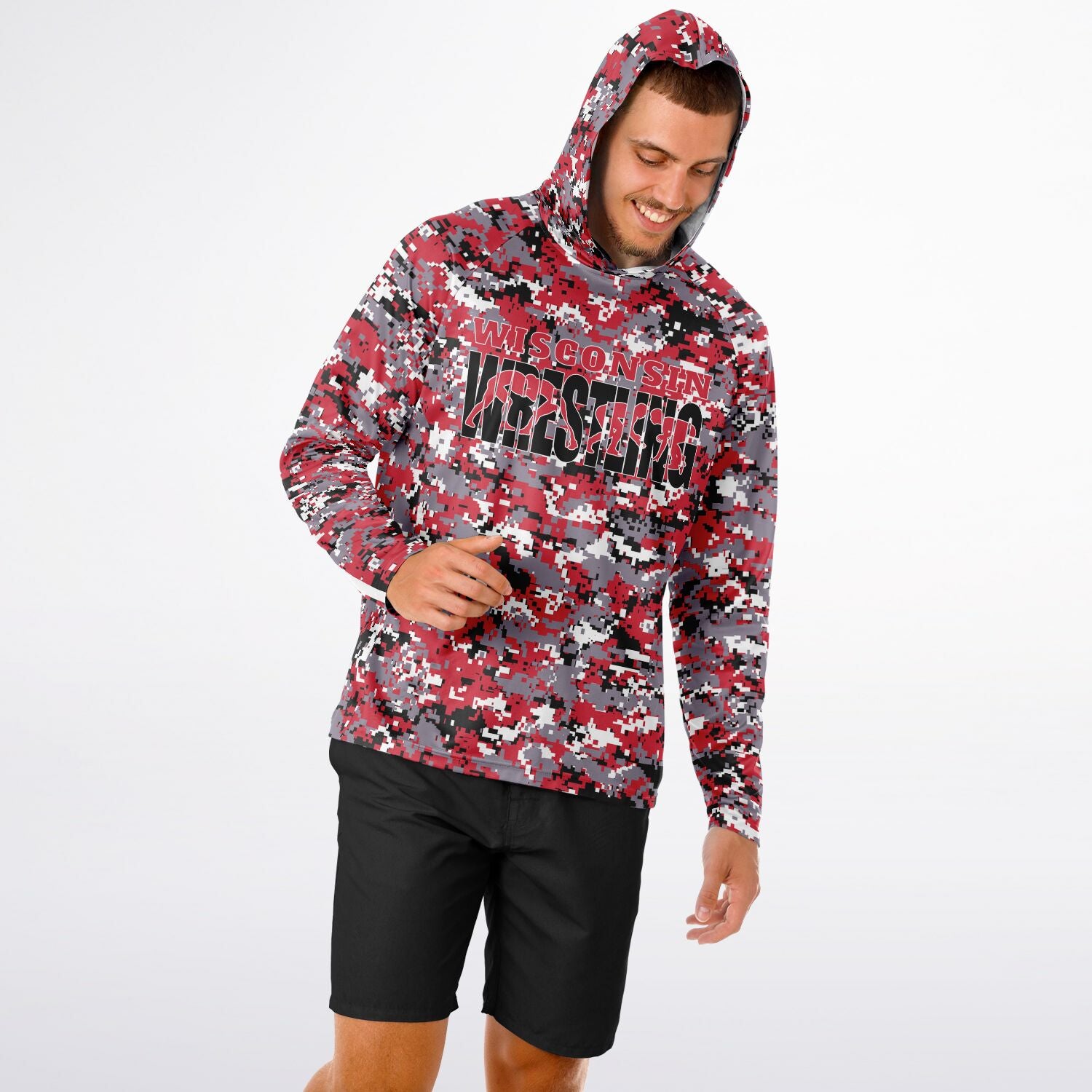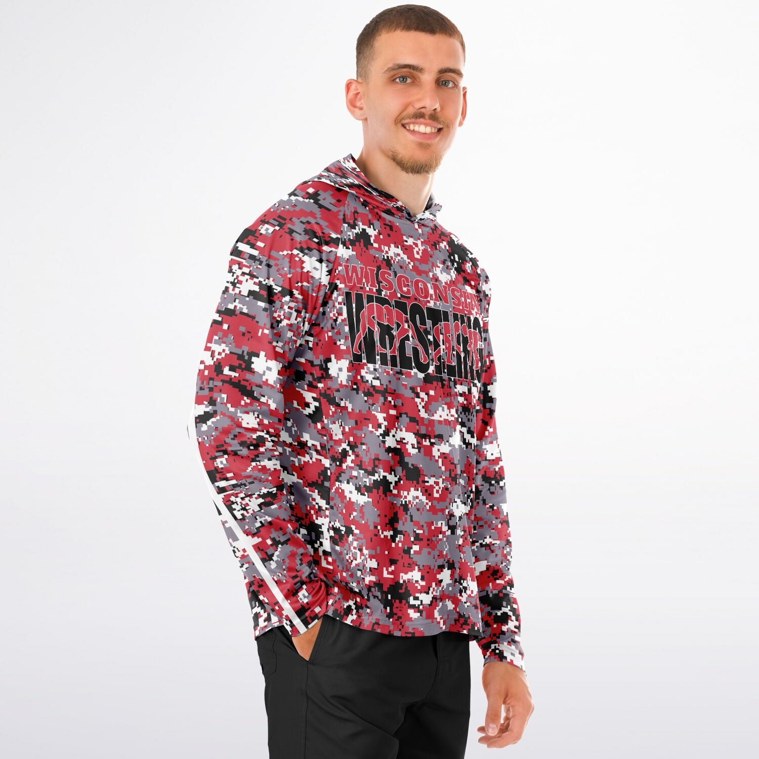 State of Wisconsin Wrestling Men's Wrestler Long Sleeve Hooded Performance Shirt - AOP Pixel Camo