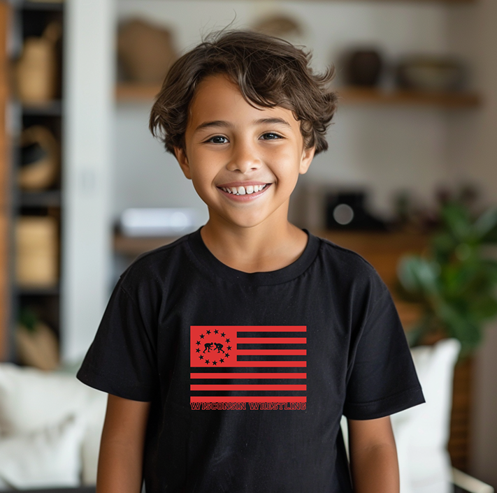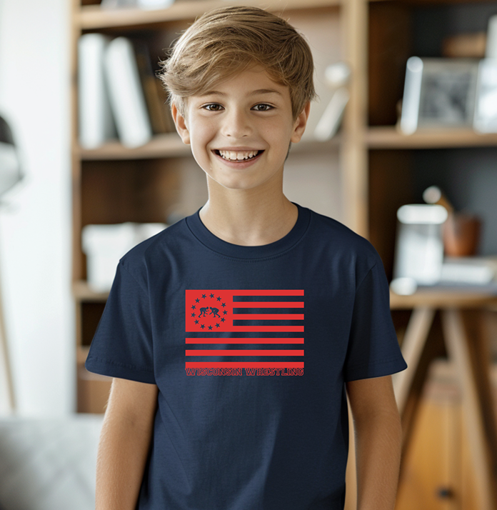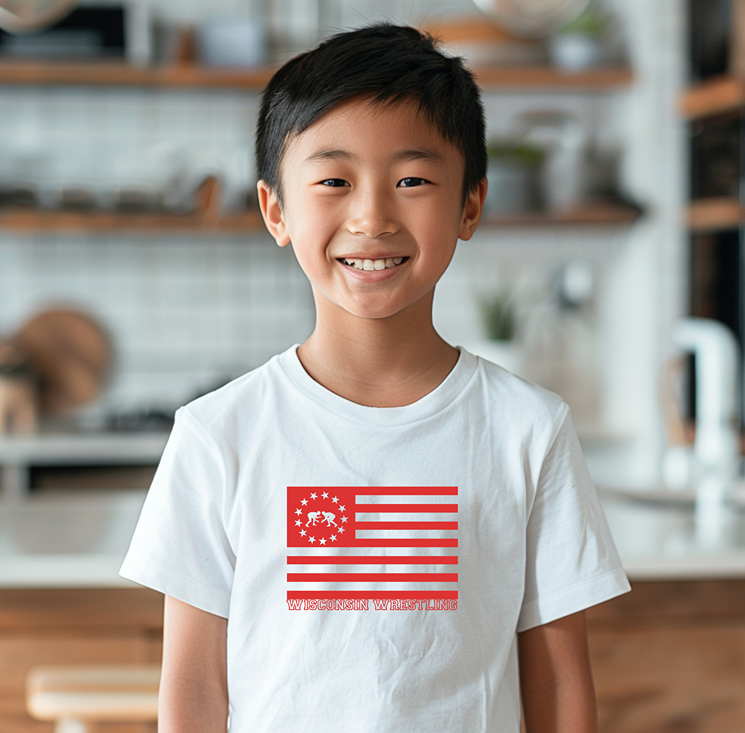 USA Flag Wrestler Badger State Fan Wisconsin Wrestling Youth Freestyle Wrestling T-Shirt Kids Wrestler Tee