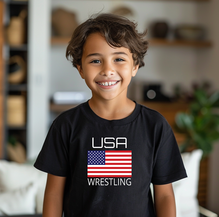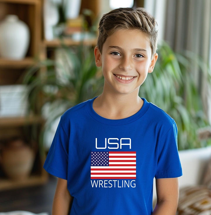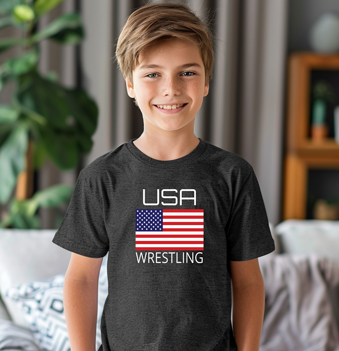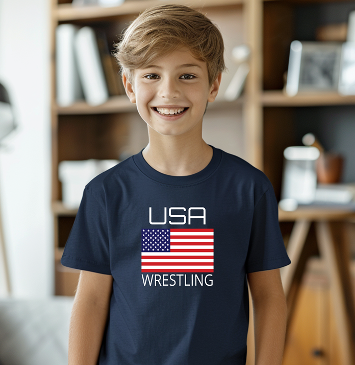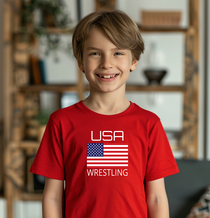 Wrestle USA American Flag Wrestler Youth Freestyle Wrestling T-Shirt Kids Wrestler Tee